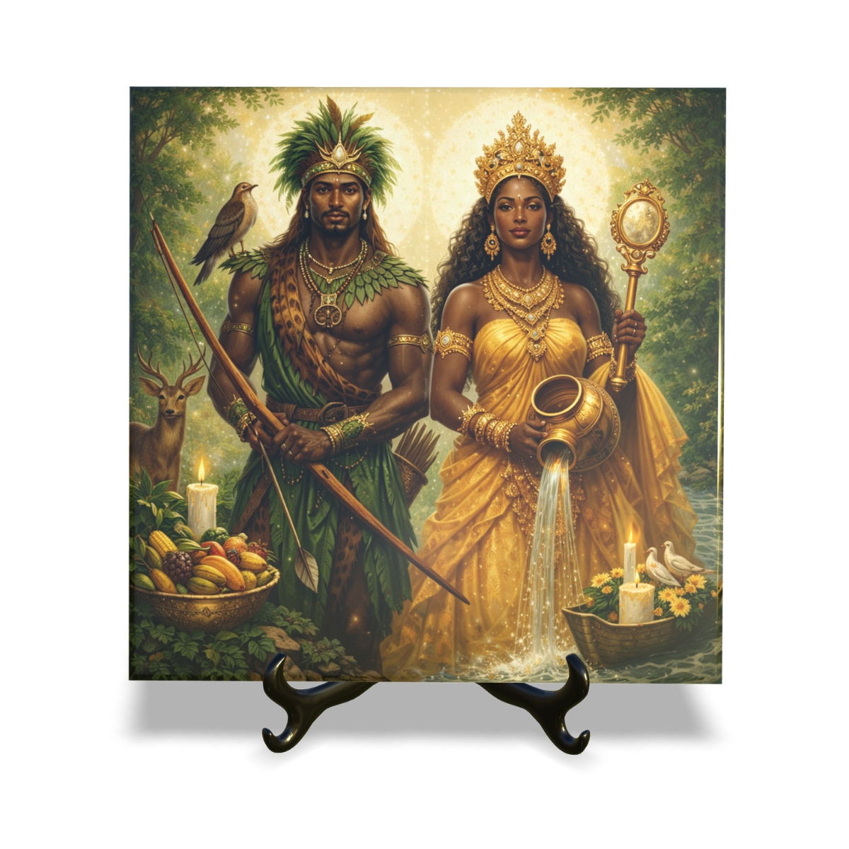 Quadro Azulejo Orixás Oxossi com Oxum com suporte Orathea Decorativo